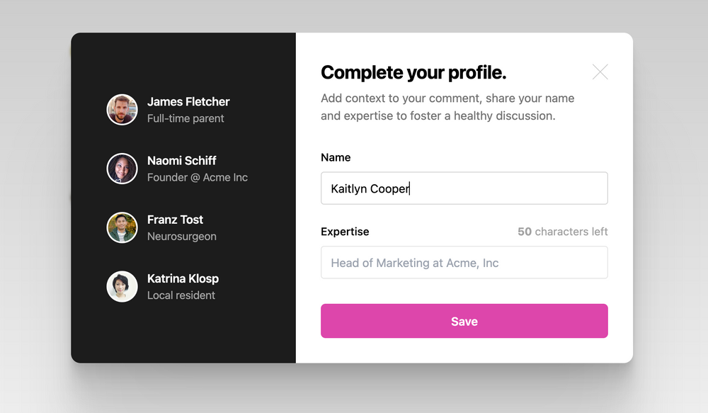Using your real name and sharing your expertise or lived experience helps give context to valuable discussions. Sharing these extra details alongside your comments shows the perspective from which you are joining the conversation.